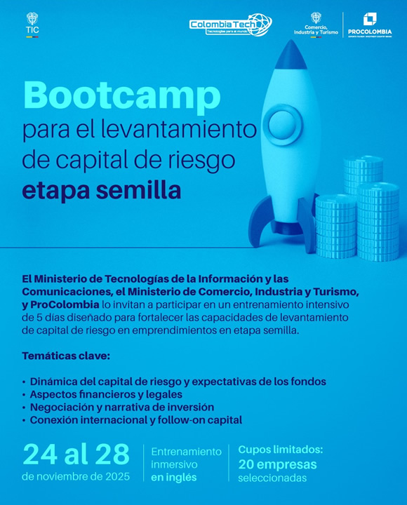 El Ministerio de Tecnologías de la Información y las Comunicaciones, el Ministerio de Comercio, Industria y Turismo de Colombia, y ProColombialo invitan a participar en el “BOOTCAMP PARA EL LEVANTAMIENTO DE CAPITAL DE RIESGO PARA EMPRENDIMIENTOS EN ETAPA SEMILLA”, un programa inmersivo de cinco (5) días diseñado para fortalecer las herramientas y habilidades necesarias para el levantamiento de capital de riesgo en emprendimientos colombianos en etapa semilla.